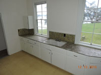 2020 - Unit #2 kitchen before with asbestos floor and damaged countertop.