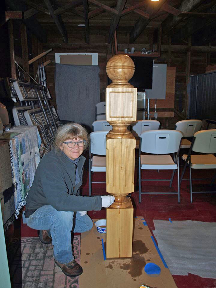 2014 - TPLPS volunteer Diana Friend with replacement newel post she made. She made all the balusters and bannisters needed to restore the historic staircase.