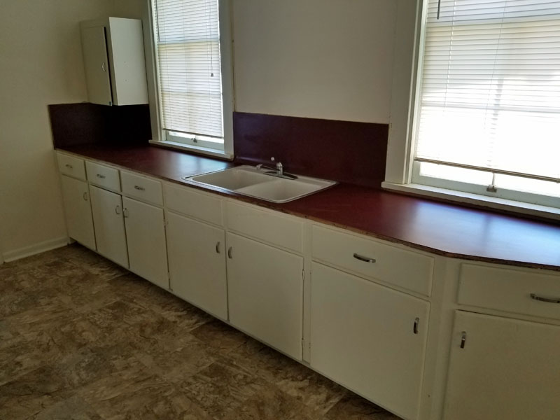 2020 - Unit #2 kitchen before with asbestos floor and damaged countertop.