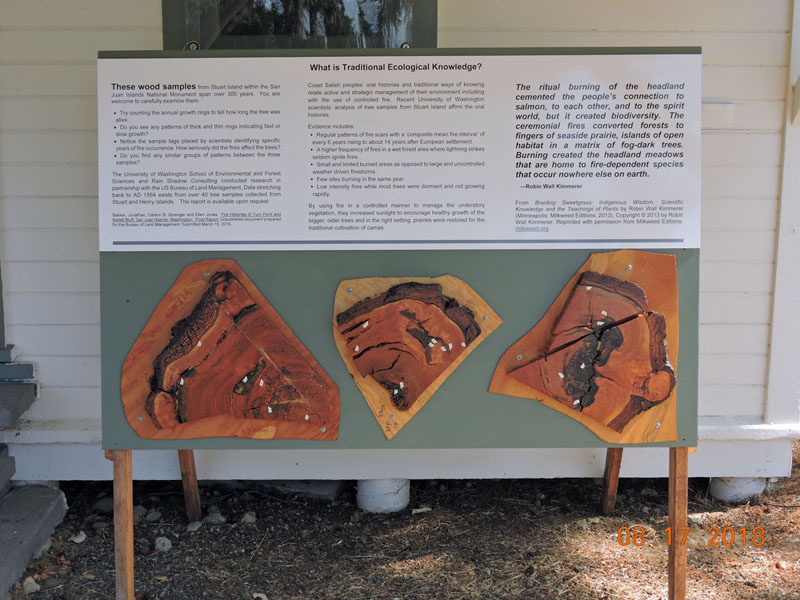2018 - TPLPS erected a display explaining the importance of fire and native use of fire to protect the forests. Slices of trees cut on Stuart Island show when fires hit the tree.